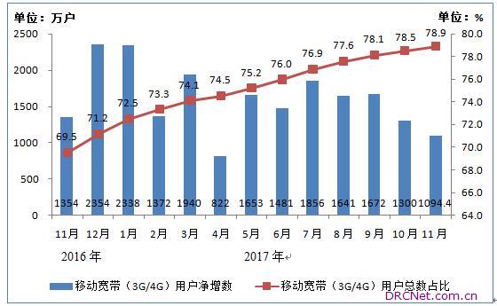固定数据及互联网业务收入同比增长9.2%。1-11月,三家基础电信企业固定数据及互联网业务收入1811亿元,同比增长9.2%。完成移动数据及移动互联网业务收入5023亿元,同比增长26.6%。 二、电信用户发展情况 移动电话用户达14.1亿,4G用户占比近七成。11月末,三家基础电信企业的移动电话用户总数14.1亿户,1-11月累计净增①8827万户。移动宽带用户(即3G和4G用户)总数达11.1亿户,占移动电话用户的78.9%。 图3 2016-2017年11月移动宽带用户当月净增数和总数占比情况