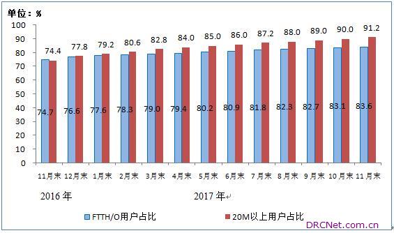 100Mbps及以上固定宽带接入用户数达1.2亿,50Mbps及以上固定宽带接入用户超过三分之二。11月末,三家基础电信企业的固定互联网宽带接入用户总数达3.46亿户。50Mbps及以上接入速率的固定互联网宽带接入用户总数达2.31亿户,占总用户数的66.9%。光纤接入(FTTH/O)用户总数达2.89亿户,比上年末净增6173万户,占固定互联网宽带接入用户总数的83.6%。 图4 2016-2017年11月光纤接入(FTTH/O)和20Mbps及以上固定宽带接入用户占比情况