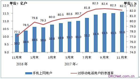 移动互联网用户增速保持两位数,IPTV用户净增超三千万。11月末,移动互联网用户总数达到12.5亿户,同比增长16.6%。使用手机上网的用户11.6亿户,对移动电话用户的渗透率为82.1%。光纤接入普及继续推动IPTV业务发展,IPTV用户总数1.18亿户。 图5 2016-2017年11月手机上网用户和对移动电话用户渗透率情况