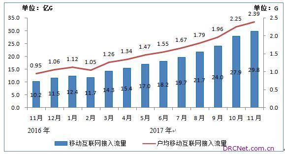 当月户均移动互联网接入流量达2.39G。11月当月户均移动互联网接入流量达到2.39G,比去年同期增长150.9%。 图8 2016-2017年11月当月移动互联网接入流量和户均流量比较