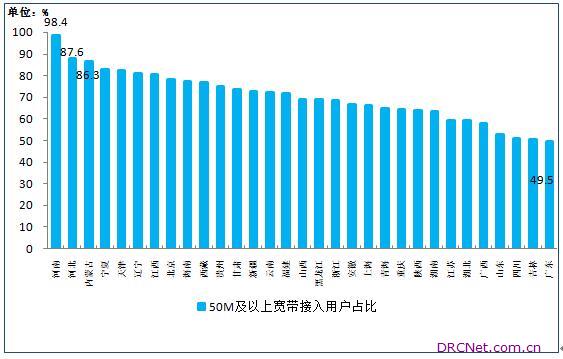 四、地区发展情况 各省光纤接入用户占比差异继续缩小。1-11月,东、中、西部地区电信业务收入同比分别增长6.5%、7.3%和8.0%,占比分别为53.4%、23.0%和23.6%。 11月末,东、中、西部地区50M及以上宽带接入用户分别达到11314万户、6585万户和5249万户,用户渗透率中部地区领先,达到73.5%,东部、西部地区分别为64.6%和64.4%。各省50M及以上宽带接入用户占比差异呈缩小态势,河南、河北和内蒙古分别居全国前三位,占比均超过85%。 图9 2017年11月末速率在50M以上的宽带接入用户占比各省分布情况