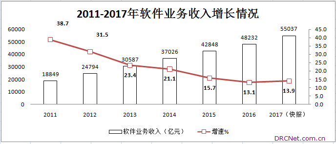 快报数据显示,2017年我国软件和信息技术服务业继续呈现稳中向好运行态势,收入和效益同步加快增长,出口有所恢复,吸纳就业人数平稳增加,创新能力不断提升,产业结构持续调整优化,服务和支撑保障能力显著增强。 一、总体运行情况 软件业务收入加快增长。2017年,全国软件和信息技术服务业完成软件业务收入5.5万亿元,比上年增长13.9%,增速同比提高0.8个百分点。从全年增长情况看,走势基本平稳。