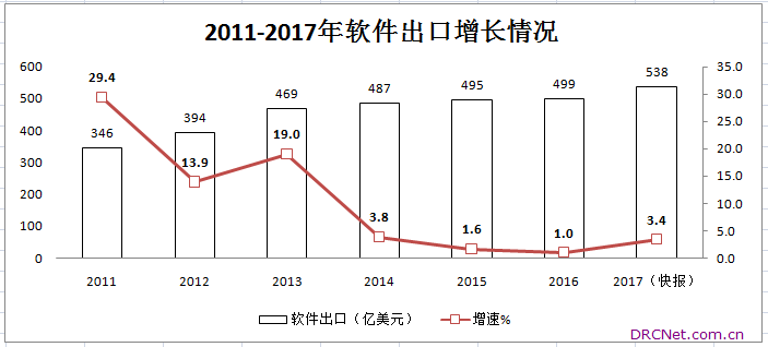 出口形势仍然低迷,但进入下半年以后情况有所改观。2017年,全国软件业实现出口538亿美元,同比增长3.4%,增速比上年提高2.4个百分点。其中,外包服务出口增长5.1%,比上年提高4.4个百分点;嵌入式系统软件出口增长2.3%。