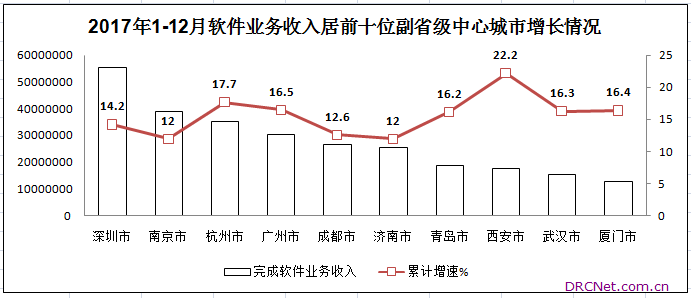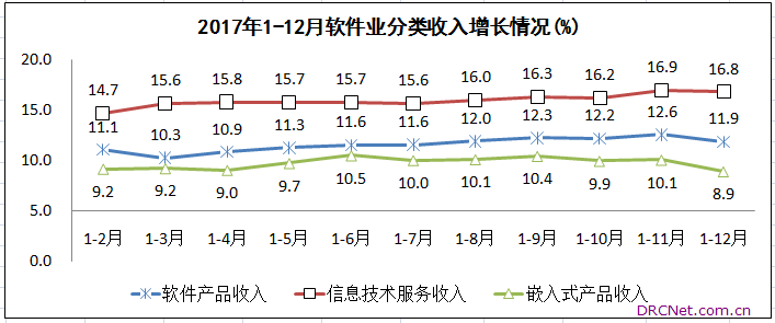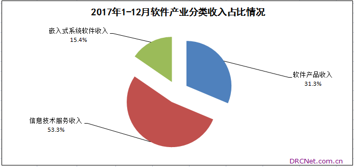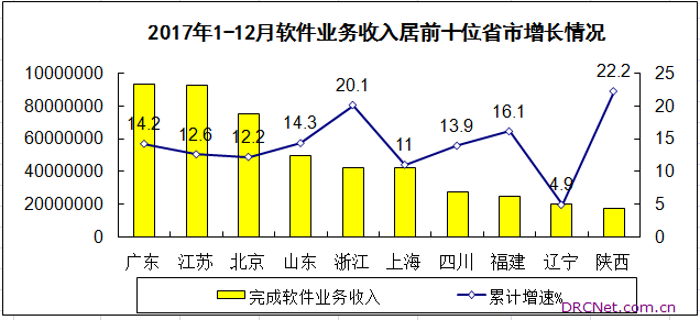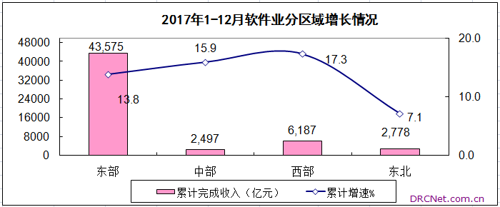 企业研发投入不断增强,创新能力逐步提升。对重点软件企业的监测显示,全年企业研发投入强度接近11%。据中国版权保护中心的数据,2017年我国软件著作权登记量突破70万件,比上年增长达85%,呈现爆发式增长;大数据、云计算、人工智能等新技术迅速得到应用和扩展,产业活力不断增强。 二、分领域运行情况 软件和信息技术服务业结构继续调整,产业生态链不断完善,为制造强国和网络强国建设提供重要支撑和保障。 信息技术服务保持领先,产业继续向服务化、云化演进。2017年,全行业实现信息技术服务收入2.9万亿元,比上年增长16.8%,增速高出全行业平均水平2.9个百分点,占全行业收入比重为53.3%。其中,云计算相关的运营服务(包括在线软件运营服务、平台运营服务、基础设施运营服务等在内的信息技术服务)收入超过8千亿元,比上年增长16.5%。 软件产品平稳增长,支撑保障能力显著增强。2017年,全行业实现软件产品收入1.7万亿元,比上年增长11.9%,占全行业收入比重为31.3%。其中,信息安全和工业软件产品收入均超过1千亿元,分别增长14%和19.9%。随着核心关键技术的突破,软件产业正向构筑有力的产业基础、推进信息系统安全可控、驱动工业智能化等方向迈进。 软件技术加快向各领域渗透,应用服务能力不断提升。支撑电子商务快速发展,电子商务平台技术服务收入比上年增长30.3%;助力集成电路产业发展,集成电路设计服务收入比上年增长15.6%;加快向通信、医院、交通、装备等各领域渗透,嵌入式系统软件已成为产品和装备数字化改造、各领域智能化增值的关键性带动技术,全年实现收入8479亿元,比上年增长8.9%。 三、分地区运行情况 东部地区稳步发展,中西部地区软件业加快增长。2017年,东部地区完成软件业务收入4.4万亿元,同比增长13.8%,占全国软件业的比重为79.2%,比上年下降0.1个百分点;中部和西部地区完成软件业务收入分别为2497亿元和6187亿元,分别增长15.9%和17.3%,占全国软件业的比重为4.5%和11.2%,比上年分别提高0.1和0.3个百分点;东北地区完成软件业务收入2778亿元,增长7.1%,占全国软件业的比重为5.1%,同比下降0.3个百分点。