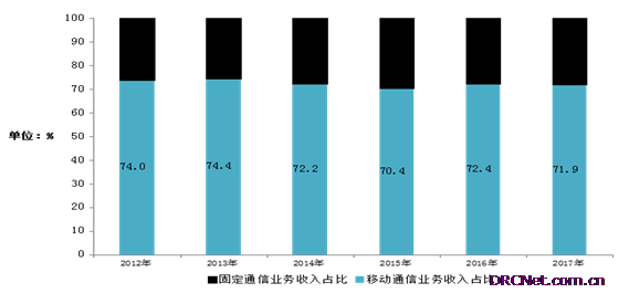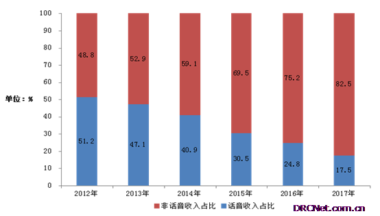 随着高速互联网接入服务发展和移动数据流量消费快速上升,话音业务(包括固定话音和移动话音)继续呈现大幅萎缩态势。2017年完成话音业务收入2212亿元,比上年下降33.5%,在电信业务收入中的占比降至17.5%,比上年下降7.3个百分点。 图1-5 2012-2017年电信收入结构(话音和非话音)情况