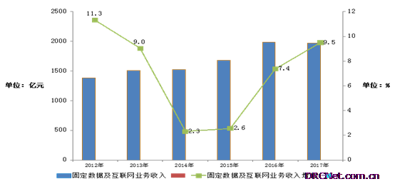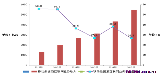 (二)数据及互联网业务稳定增长,话音等传统业务继续萎缩 宽带中国战略加快实施带动数据及互联网业务加快发展。2017年,在固定通信业务中固定数据及互联网业务收入达到1971亿元,比上年增长9.5%,在电信业务收入中占比由上年的15.2%提升到15.6%,拉动电信业务收入增长1.4个百分点,对全行业业务收入增长贡献率达21.9%。受益于光纤接入速率大幅提升,家庭智能网关、视频通话、IPTV等融合服务加快发展。全年IPTV业务收入121亿元,比上年增长32.1%;物联网业务收入比上年大幅增长86%。 图1-3 2012-2017年固定数据及互联网业务收入情况 2017年,在移动通信业务中移动数据及互联网业务收入5489亿元,比上年增长26.7%,在电信业务收入中占比从上年的38.1%提高到43.5%,对收入增长贡献率达152.1%。 图1-4 2012-2017年移动数据及互联网业务收入情况
