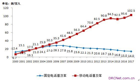 二、网络提速和普遍服务效果显现 (一)电话用户规模稳步扩大,移动电话普及率首次破百 2017年,全国电话用户净增8269万户,总数达到16.1亿户,比上年增长5.4%。其中,移动电话用户净增9555万户,总数达14.2亿户,移动电话用户普及率达102.5部/百人,比上年提高6.9部/百人,全国已有16省市的移动电话普及率超过100部/百人。固定电话用户总数1.94亿户,比上年减少1286万户,每百人拥有固定电话数下降至14部。 图2-1 2000-2017年固定电话、移动电话用户发展情况