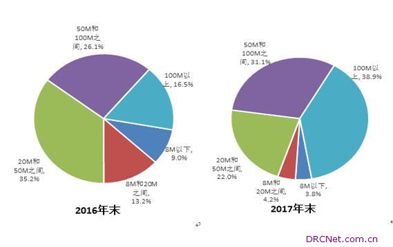 (二)网络提速效果显著,高速率宽带用户占比大幅提升 进一步落实网络提速要求,加快拓展光纤接入服务和优化4G服务,努力提升用户获得感。截至12月底,三家基础电信企业的固定互联网宽带接入用户总数达3.49亿户,全年净增5133万户。其中,50Mbps及以上接入速率的固定互联网宽带接入用户总数达2.44亿户,占总用户数的70%,占比较上年提高27.4个百分点;100Mbps及以上接入速率的固定互联网宽带接入用户总数达1.35亿户,占总用户数的38.9%,占比较上年提高22.4个百分点。截至12月底,移动宽带用户(即3G和4G用户)总数达11.3亿户,全年净增1.91亿户,占移动电话用户的79.8%。4G用户总数达到9.97亿户,全年净增2.27亿户。 图2-2 2016-2017年固定互联网宽带各接入速率用户占比情况