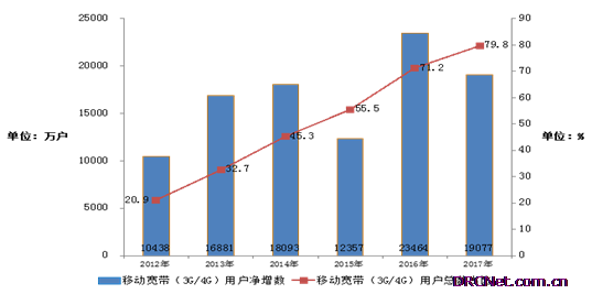 图2-3 2012-2017年移动宽带用户(3G/4G)发展情况