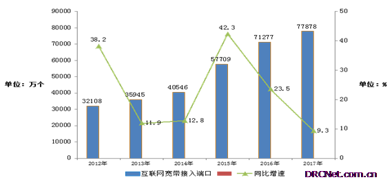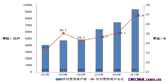 (三)普遍服务继续推进,农村宽带用户增长加速 2017年末,电信业完成3.2万个行政村通光纤的电信普遍服务任务部署。全国农村宽带用户达到9377万户,全年净增用户1923万户,比上年增长25.8%,增速较上年提高9.3个百分点;在固定宽带接入用户中占26.9%,占比较上年提高1.8个百分点。 图2-4 2012-2017年农村宽带接入用户情况