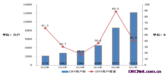 (四)行业融合加深,新业务发展动能强劲 加快培育新兴业务,扎实提高IPTV、物联网、智慧家庭等服务能力。2017年末,IPTV用户数达到1.22亿户,全年净增3545万户,净增用户占光纤接入净增用户总数的53.5%。 图2-5 2012-2017年IPTV用户及增速情况