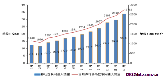 三、移动数据流量消费等新兴业务继续大幅攀升 (一)移动互联网应用加快普及,户均流量翻倍增长 4G移动电话用户扩张带来用户结构不断优化,支付、视频广播等各种移动互联网应用普及,带动数据流量呈爆炸式增长。2017年,移动互联网接入流量消费达246亿GB②,比上年增长162.7%,增速较上年提高38.7个百分点。全年月户均移动互联网接入流量达到1775MB/月/户,是上年的2.3倍,12月当月户均接入流量高达2752MB/月/户。其中,手机上网流量达到235亿GB,比上年增长179%,在移动互联网总流量中占95.6%,成为推动移动互联网流量高速增长的主要因素。 图3-1 2012-2017年移动互联网接入流量增长情况