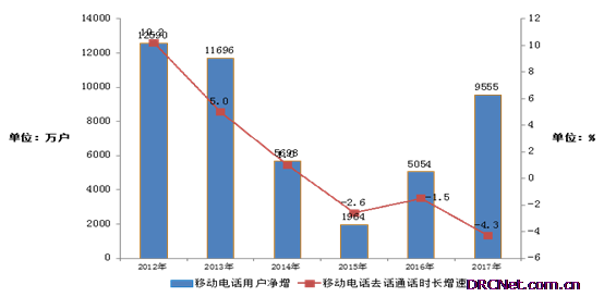 (二)互联网应用替代作用增强,传统业务持续下降 2017年,全国移动电话去话通话时长2.69万亿分钟,比上年减少4.3%,降幅较上年扩大2.8个百分点。全国移动短信业务量6644亿条,比上年减少0.4%。其中,由移动用户主动发起的点对点短信量比上年减少30.2%,占移动短信业务量比重由上年的28.5%降至19.9%。彩信业务量只有488亿条,比上年减少12.3%。移动短信业务收入358亿元,比上年减少2.6%。 图3-3 2012-2017年移动电话去话通话时长增速和移动用户净增情况