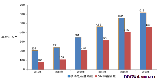 四、网络基础设施建设继续加强 (一)信息网络建设扎实推进,4G移动网络深覆盖 着力提升网络品质,加快光纤网络建设,完善4G网络覆盖深度,不断消除覆盖盲点,移动网络服务质量和覆盖范围继续提升。2017年,全国净增移动通信基站59.3万个,总数达619万个,是2012年的3倍。其中4G基站净增65.2万个,总数达到328万个。 图4-1 2012-2017年移动电话基站发展情况