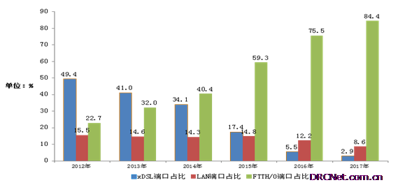 图4-3 2012-2017年互联网宽带接入端口按技术类型占比情况