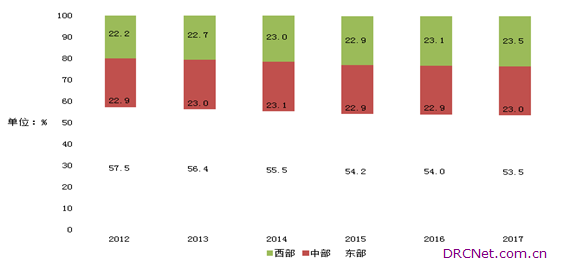 五、东中西部地区协调发展 (一)东部地区电信业务收入继续占据半壁江山,中西部地区占比有所上升 2017年,东部地区实现电信业务收入6759亿元,比上年增长6.6%,占全国电信业务收入比重为53.5%,占比较上年减少0.5个百分点。中部和西部实现电信业务收入分别为2908亿元和2978亿元,比上年增长7.4%和8.5%,占比分别为23%和23.5%,比上年提升了0.1个、0.4个百分点。 图5-1 2012-2017年东、中、西部地区电信业务收入比重