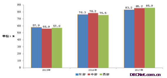 (二)东中西部光纤宽带接入用户渗透率均超过八成,西部地区提升明显 2017年,东、中、西部光纤接入用户分别达到14585万户、7708万户和7100万户,比上年分别增长24.9%、29.3%和38.5%。西部地区增速比东部和中部分别快13.6个和9.2个百分点。东、中、西部光纤接入用户在固定宽带接入用户中的占比分别达到83.2%、85.2%和85.9%,其中西部地区较上年大幅提高10.4个百分点。 图5-2 2015-2017年东、中、西部地区光纤宽带接入用户渗透率