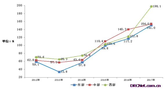 (三)东中西部移动数据业务均呈现加快发展态势,西部增长接近两倍 2017年,东、中、西部地区移动互联网接入流量分别达到121亿GB、59.9亿GB和64.9亿GB,比上年分别增长151%、154%和198.1%,西部增速比东部、中部增速分别高47.1个和44.1个百分点。东、中、西部地区月户均流量达到1780MB/月/户、1680MB/月/户、1865MB/月/户,西部比东部和中部分别高85MB/月/户和185MB/月/户。 图5-3 2012-2017年东、中、西部移动互联网接入流量增速
