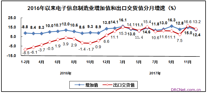 2017年,我国宏观环境持续好转,内需企稳回暖,外需逐步复苏,结构调整、转型升级步伐加快,企业生产经营环境得到明显改善。电子信息制造业实现较快增长,生产与投资增速在工业各行业中保持领先水平,出口形势明显好转,效益质量持续提升。 一、生产情况 生产保持较快增长。2017年,规模以上电子信息制造业增加值比上年增长13.8%,增速比2016年加快3.8个百分点;快于全部规模以上工业增速7.2个百分点,占规模以上工业增加值比重为7.7%。其中,12月份增速为12.4%,比11月份回落2.6个百分点。 出口形势有所好转。2017年,出口交货值同比增长14.2%(2016年为下降0.1%),快于全部规模以上工业出口交货值增速3.5个百分点,占规模以上工业出口交货值比重为41.4%。其中,12月份出口交货值同比增长13.2%,比11月份回落3.4个百分点。