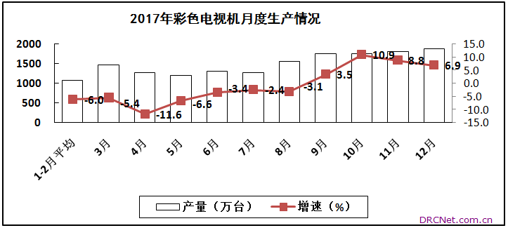 家用视听行业生产持续低迷,出口增速加快。2017年,生产彩色电视机17233万台,比上年增长1.6%,增速比2016年回落7.1个百分点;其中液晶电视机16901万台,比上年增长1.2%;智能电视10931万台,比上年增长6.9%,占彩电产量比重为63.4%。实现出口交货值比上年增长11.8%,同比加快10个百分点。