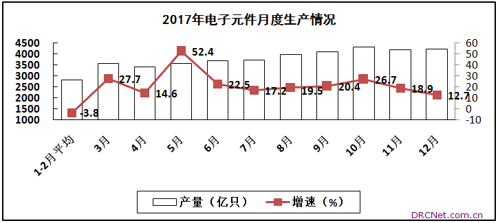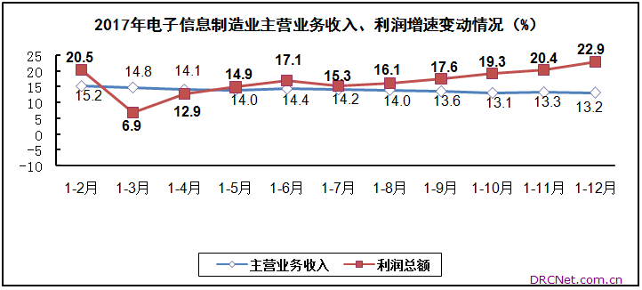 电子元件行业生产稳中有升,出口增速加快。2017年,生产电子元件44071亿只,比上年增长17.8%。实现出口交货值比上年增长20.7%,增速比2016年加快18.1个百分点。 电子器件行业生产、出口实现快速增长。2017年,生产集成电路1565亿块,比上年增长18.2%。实现出口交货值比上年增长15.1%(2016年为下降0.7%)。 二、效益情况 行业效益持续改善。2017年,全行业实现主营业务收入比上年增长13.2%,增速比2016年提高4.8个百分点;实现利润比上年增长22.9%,增速比2016年提高10.1个百分点。主营业务收入利润率为5.16%,比上年提高0.41个百分点;企业亏损面16.4%,比上年扩大1.7个百分点,亏损企业亏损总额比上年下降4.6%。2017年末,全行业应收账款比上年增长16.4%,高于同期主营业务收入增幅3.2个百分点;产成品存货比上年增长10.4%,增速同比加快7.6个百分点。
