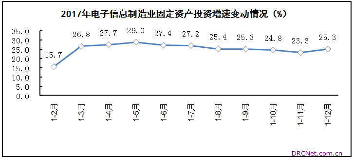 运行质量进一步提升。2017年,电子信息制造业每百元主营业务收入中的成本、费用合计为95.63元,比上年减少0.24元;产成品存货周转天数为12.9天,比上年减少0.4天;应收账款平均回收周期为71.1天,比上年增加2.7天。每百元资产实现的主营业务收入为131.4元,比上年增加7.3元;人均实现主营业务收入为119.8万元,比上年增加11.2万元;资产负债率为57.3%,比上年下降0.2个百分点。 三、固定资产投资情况 固定资产投资保持高速增长。2017年,电子信息制造业500万元以上项目完成固定资产投资额比上年增长25.3%,增速比2016年加快9.5个百分点,连续10个月保持20%以上高位增长。电子信息制造业本年新增固定资产同比增长35.3%(2016年为下降10.9%)。 通信设备、电子器件行业投资增势突出。2017年,整机行业中通信设备投资较快增长,完成投资比上年增长46.4%,同比加快16.1个百分点;家用视听行业完成投资比上年增长7.6%;电子计算机行业完成投资比上年下降2.3%。电子器件行业完成投资比上年增长29.9%;电子元件行业完成投资比上年增长19.0%。
