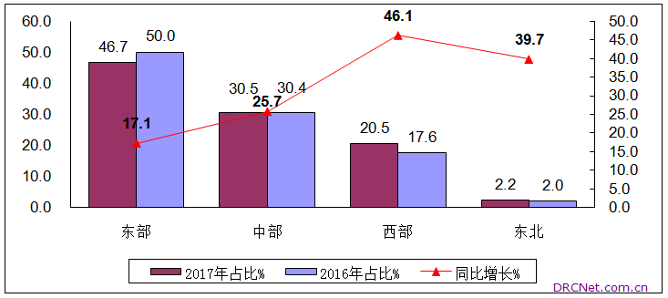 内资企业投资增长较快。2017年,内资企业完成投资比上年增长29.1%,其中国有企业和有限责任公司增长较快,增速分别为40.5%和32.5%。港澳台企业完成投资比上年增长10.5%。外商投资企业完成投资比上年增长13.7%。 西部地区投资增速领跑,东北地区投资明显好转。2017年,东部地区投资增长平稳,完成投资同比增长17.1%,增速比2016年回落1.6个百分点,其中河北、广东投资增长较快,分别增长46.4%和41.9%;中部地区投资增长较快,完成投资同比增长25.7%,增速比2016年提高11.7个百分点,其中江西、安徽投资增长较快,分别增长76.2%和24.6%;西部地区投资增速领跑,完成投资同比增长46.1%,增速比2016年提高26.3个百分点,其中云南、贵州、四川投资增长较快,同比分别增长338.9%、120.9%和118.0%;东北地区投资由降转升,完成投资同比增长39.7%(2016年为下降29.6%),黑龙江、辽宁投资分别增长109.7%和60.8%。