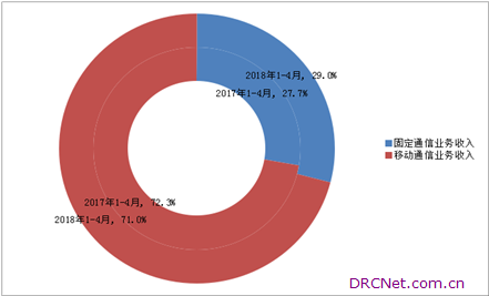 固定通信业务收入在总收入中比重上升。1-4月,三家基础电信企业实现移动通信业务收入3145亿元,同比增长2.6%,占电信业务收入的71%;实现固定通信业务收入1286亿元,同比增长9.7%,在电信业务收入中占29%。 图3 2018年1-4月固定和移动业务收入占比情况