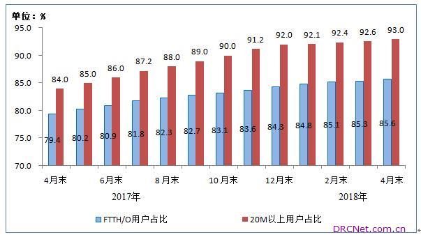 光纤接入(FTTH/O)用户数达3.13亿,100Mbps及以上固定宽带接入用户占比达47.1%。4月末,三家基础电信企业的固定互联网宽带接入用户总数达3.66亿户,1-4月净增1773万户。其中,光纤接入(FTTH/O)用户总数达到3.13亿户,占固定互联网宽带接入用户总数的85.6%,较去年末提高1.3个百分点。按速率划分,20Mbps及以上接入速率的固定互联网宽带接入用户总数达3.41亿户,占比为93%;50Mbps及以上和100Mbps及以上接入速率的固定互联网宽带接入用户总数分别达2.8亿户和1.72亿户,占总用户数的76.4%和47.1%。 图5 2017年4月末-2018年4月末光纤接入(FTTH/O)和 20Mbps及以上接入速率的固定互联网宽带接入用户占比情况