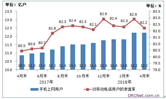 手机上网用户规模保持稳定,光纤接入普及继续推动IPTV业务发展。4月末,移动互联网用户总数达到13.2亿户,同比增长15.3%。使用手机上网的用户12.2亿户,与上月持平,对移动电话用户的渗透率为82.2%。IPTV用户总数1.36亿户,1-4月净增1417万户。 图6 2017年4月末-2018年4月末手机上网用户情况