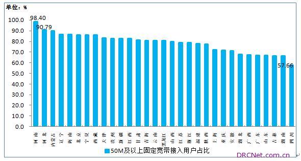 四、地区发展情况 中部50M及以上固定宽带接入用户占比保持领先。4月末,东、中、西部地区50M及以上接入速率的固定互联网宽带接入用户分别达到13903万户、7684万户和6384万户,占本地区固定互联网宽带接入用户总数的比重分别为76.7%、79%、72.8%,中部地区领先。各省50M及以上接入速率的固定互联网宽带接入用户占比差异呈缩小态势,河南、河北居全国前两位,占比均超过90%。 图10 50M及以上接入速率的固定互联网宽带接入用户占比各省分布情况