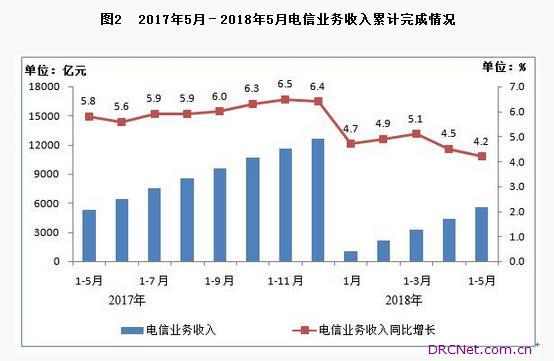 一、总体运行情况 电信业务收入增速小幅放缓。2018年1-5月,电信业务收入累计完成5576亿元,同比增长4.2%,增速较上月下滑0.3个百分点;电信业务总量①完成20306亿元,同比增长129.1%,增速保持稳步提高态势,5月当月增速达143.1%。