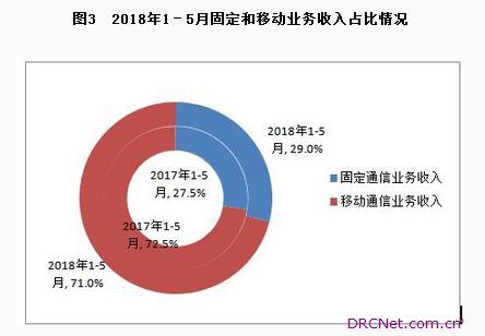固定通信业务收入占比小幅提高。1-5月,三家基础电信企业实现固定通信业务收入1616亿元,同比增长10%,在电信业务收入中占29%;实现移动通信业务收入3960亿元,同比增长2%,占电信业务收入的71%。