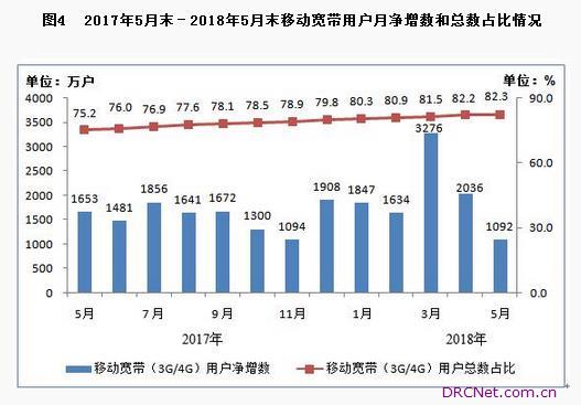 移动数据及互联网业务收入快速增长。1-5月,三家基础电信企业完成移动数据及移动互联网业务收入2569亿元,同比增长13.2%,占电信业务收入的46.1%;完成固定数据及互联网业务收入875亿元,同比增长7%,占电信业务收入的15.7%。 二、电信用户发展情况 移动电话用户数近15亿,4G用户占比达73%。截至5月末,三家基础电信企业的移动电话用户总数近15亿户,同比增长10%,1-5月净增②7831万户。其中,移动宽带用户(即3G和4G用户)总数达12.3亿户,占移动电话用户的82.3%;4G用户总数达到10.9亿户,占移动电话用户的73%。