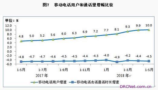 三、电信业务使用情况 移动电话通话量降幅小幅波动。1-5月,全国移动电话去话通话时长完成10669亿分钟,同比下降4.5%,降幅近一年保持在4%到5%之间;全国固定本地电话通话时长完成524亿分钟,同比下降18.9%。