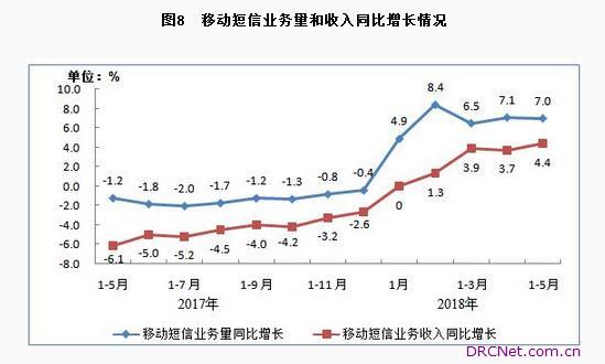 移动短信业务量和收入继续保持增长。1-5月,全国移动短信业务量完成2875亿条,同比增长7%(去年同期同比下降1.2%);移动短信业务收入完成155亿元,同比增长4.4%(去年同期同比下降6.1%),增速从今年开始保持正增长态势;移动彩信业务量同比下降11.2%,发送总量184亿条。
