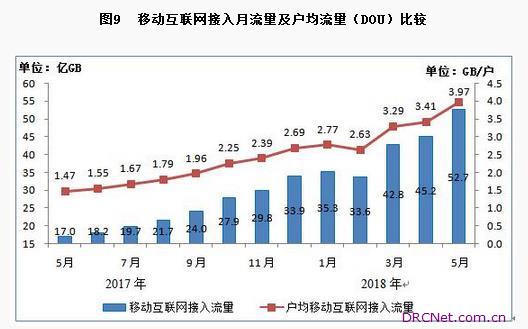 5月份户均移动互联网接入流量(DOU)近4GB。1-5月移动互联网累计流量达210亿GB,同比增长196.3%;其中通过手机上网的流量达到206亿GB,同比增长212.3%,占移动互联网总流量的98.1%。5月当月户均移动互联网接入流量(DOU)达到3.97GB,同比增长169.3%,增速较上月提高15.4个百分点,再创新高。固定互联网使用量保持稳步快速增长,1-5月固定互联网宽带接入流量同比增长47.4%。