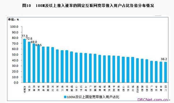 四、地区发展情况 东部100M及以上固定宽带接入用户占比领先。5月末,东、中、西部地区100M及以上接入速率的固定互联网宽带接入用户分别达到9922万户、4695万户和4143万户,占本地区固定互联网宽带接入用户总数的比重分别为54.1%、47.6%、46.4%,东部地区领先。各省100M及以上接入速率的固定互联网宽带接入用户占比差异呈缩小态势,内蒙古、北京、天津和甘肃居全国前四位,占比均超过65%。 ①按照2015年电信业务不变单价计算。 ②根据2017年12月快报数据计算得到,下同。