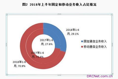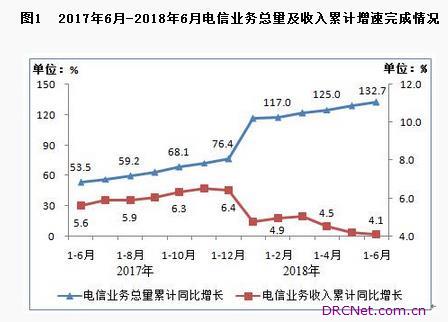 一、总体运行情况 电信业务收入增速小幅回落。2018年上半年,电信业务收入累计完成6720亿元,同比增长4.1%,增速较1-5月下滑0.1个百分点;电信业务总量①完成25570亿元,同比增长132.7%,增速逐月提升,6月当月增速达147.4%。 固定通信业务收入增速保持两位数。上半年,三家基础电信企业实现固定通信业务收入1958亿元,同比增长10%;实现移动通信业务收入4762亿元,同比增长1.8%,占电信业务收入的70.9%。