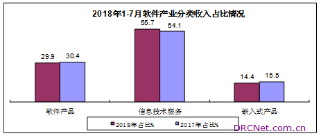 二、分领域运行情况 软件产品收入稳步增长,信息安全产品和工业软件产品发展态势良好。1-7月,全行业实现软件产品收入10295亿元,同比增长12.9%,增速同比提高1.6个百分点,比1-6月回落0.7个百分点。其中,信息安全产品和工业软件产品分别增长14.3%和14.2%,增速均高于软件产品平均水平。 信息技术服务收入加快增长,在线运营及平台类信息技术服务收入增势突出。1-7月,全行业实现信息技术服务收入19199亿元,同比增长18.2%,增速同比提高2.6个百分点,比1-6月提高1.2个百分点,在全行业收入中占比为55.7%。其中,运营相关服务收入增长25%,电子商务平台技术服务收入增长17%;集成电路设计服务收入增长5.6%;其他信息技术服务(包括信息技术咨询设计服务、系统集成、运维服务、数据服务等)增长16.5%。