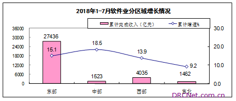 东部地区软件业收入增速加快,东北地区增速持续回升。1-7月,东部地区完成软件业务收入27436亿元,同比增长15.1%,增速同比提高1.9个百分点;总量居前5名的广东、江苏、北京、浙江、山东完成软件业务收入累计占全国比重为64.8%,分别增长13.3%、11.4%、19.8%、19.9%和14.5%,其中北京和浙江增速高出全国平均水平5和5.1个百分点。东北地区完成软件业务收入1462亿元,同比增长9.2%,增速同比提高3.7个百分点。