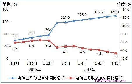 一、总体运行情况 电信业务收入增速持续回落。1-8月,电信业务收入累计完成8881亿元,同比增长3.3%,增速较1-7月下滑0.4个百分点;电信业务总量①完成37275亿元,同比增长139.1%,增速逐月提升,8月当月增速达152.6%。 图1 2017年8月-2018年8月电信业务总量及收入累计增速完成情况