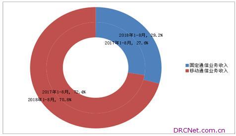 固定通信业务收入占比小幅提升。1-8月,三家基础电信企业实现固定通信业务收入2594亿元,同比增长9.3%,在电信业务收入中占29.2%,占比较去年同期提高1.6个百分点;实现移动通信业务收入6287亿元,同比增长1%,占电信业务收入的70.8%。 图2 2018年1-8月固定和移动业务收入占比情况