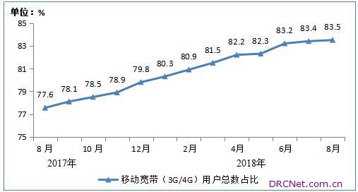 移动数据及互联网业务收入增速持续放缓。1-8月,三家基础电信企业完成移动数据及移动互联网业务收入4106亿元,同比增长11.5%,收入增速较1-7月回落0.8个百分点;移动数据及移动互联网业务收入占电信业务收入的46.2%,占比较去年同期提高3.3个百分点;完成固定数据及互联网业务收入1397亿元,同比增长6.1%,占电信业务收入的15.7%。 二、电信用户发展情况 4G用户数达11.4亿,移动宽带用户占比达83.5%。不限量套餐服务刺激移动电话用户继续保持较快增长。截至8月末,三家基础电信企业的移动电话用户总数达15.4亿户,同比增长11.3%。其中,移动宽带用户(即3G和4G用户)总数达12.8亿户,占移动电话用户的83.5%;4G用户总数达到11.4亿户,占移动电话用户的74.1%。 图3 2017年8月末-2018年8月末移动宽带用户总数占比情况
