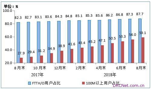 光纤接入(FTTH/O)用户达3.4亿,100Mbps及以上固定宽带接入用户占比达59.1%。截至8月末,三家基础电信企业的固定互联网宽带接入用户总数达3.88亿户,1-8月净增3940万户。其中,光纤接入(FTTH/O)用户总数达到3.4亿户,占固定互联网宽带接入用户总数的87.7%。宽带用户持续向高速率迁移,50Mbps及以上和100Mbps及以上接入速率的固定互联网宽带接入用户总数分别达到3.22亿户和2.29亿户,占总用户数的83%和59.1%。 图4 2017年8月末-2018年8月末光纤接入(FTTH/O)和100Mbps及以上接入速率的固定互联网宽带接入用户占比情况