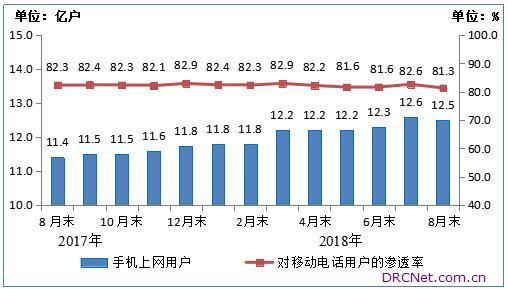 IPTV用户规模持续扩大,手机上网用户占比出现回落。截至8月末,基础电信企业发展的IPTV用户总数达1.47亿户,1-8月净增2509万户。移动互联网用户总数保持在13.7亿户,同比增长12.2%。其中,手机上网的用户数达12.5亿户,对移动电话用户的渗透率为81.3%。 图5 2017年8月末-2018年8月末手机上网用户情况