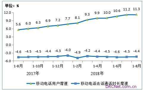 三、电信业务使用情况 移动电话通话量持续下降。1-8月,全国移动电话去话通话时长完成17151亿分钟,同比下降4.4%;全国固定本地电话通话时长完成838亿分钟,同比下降19.7%。 图6 移动电话用户和通话量增幅比较