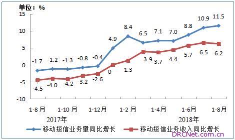 移动短信业务量和收入保持增长态势。服务登录和身份认证等服务的普及,使企业短信业务量今年以来保持大幅提升的态势,1-8月,全国移动短信业务同比增长11.5%;移动短信业务收入完成256亿元,同比增长6.2%,增速从今年开始保持正增长态势;移动彩信业务量同比下降13.1%。 图7 移动短信业务量和收入同比增长情况