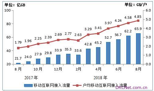 8月份户均移动互联网接入流量(DOU)达4.85GB。1-8月移动互联网累计流量达395亿GB,同比增长203.4%;其中通过手机上网的流量达到389亿GB,同比增长217.5%,占移动互联网总流量的98.4%。8月当月DOU(户均移动互联网接入流量)达到4.85GB,同比增长170.4%。固定互联网使用量保持较快增长,1-8月固定互联网宽带接入流量同比增长42.9%。 图8 移动互联网接入月流量及户均流量(DOU)比较