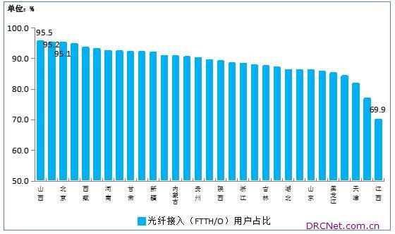 四、地区发展情况 西部光纤接入(FTTH/O)用户渗透率超九成。截至8月末,东、中、西部地区光纤接入(FTTH/O)用户分别达到16322万户、9056万户和8628万户,占本地区固定互联网宽带接入用户总数的比重分别为86.1%、87.8%、90.1%,西部地区占比领先。各省光纤接入(FTTH/O)用户占比差异呈缩小态势,山西、宁夏和北京位居前三,占比均超过95%。 图9 光纤接入(FTTH/O)用户占比各省分布情况